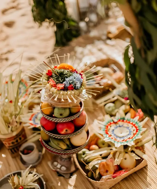 The Balinese prepare banten, which are offerings consisting of flowers, fruits, traditional foods, and leaves. Banten are presented at temples, homes, and workplaces as a form of respect to the gods and ancestral spirits. Besides their spiritual meaning, banten also showcase the beauty of art and meticulous craftsmanship in Balinese Hindu traditions.