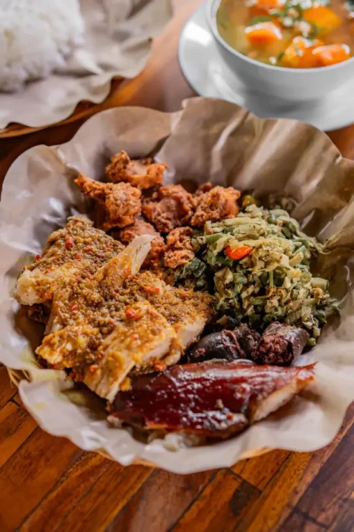The most popular menu item at Babi Guling Ibu Oka is the Special Mixed Rice (Nasi Campur Spesial), which offers a complete combination of classic Balinese flavors in one plate. Each serving includes tender slices of roast pork, traditional Balinese lawar (a vegetable and spice mixture), and the famously crispy pork skin.