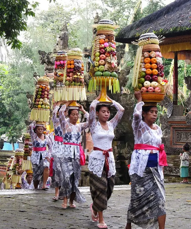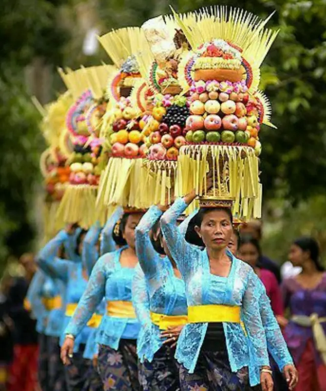 The procession symbolizes purification, gratitude, and spiritual balance central to Balinese Hinduism.