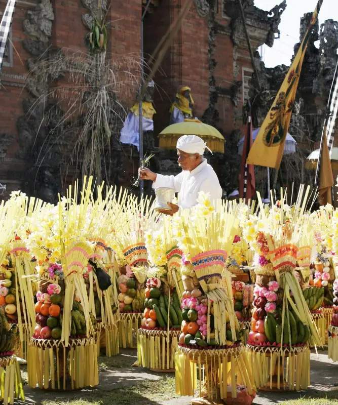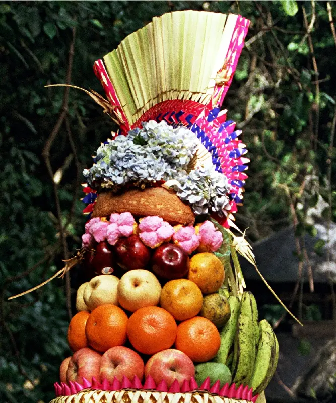 Arrangements of fresh flowers, sacred rice, and tropical fruits artfully stacked in grand gebogan for ancestral spirits and deities.