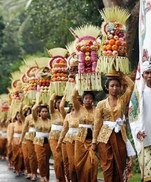 The procession symbolizes purification, gratitude, and spiritual balance central to Balinese Hinduism.
