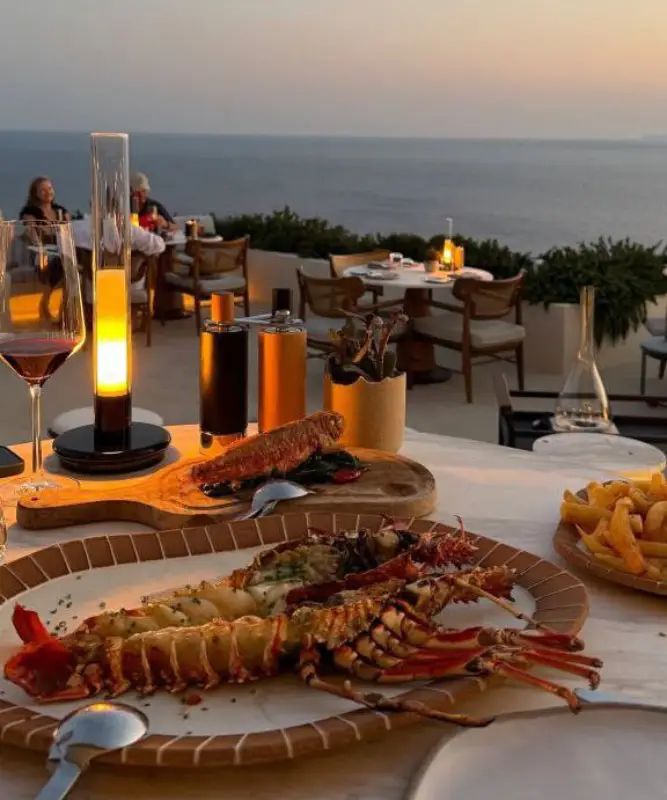 The menu features gourmet dishes and fresh seafood. Guests also enjoy creative tapas and signature cocktails. The minimalist design blends naturally with the surroundings. Each dish is visually appealing and full of flavor.